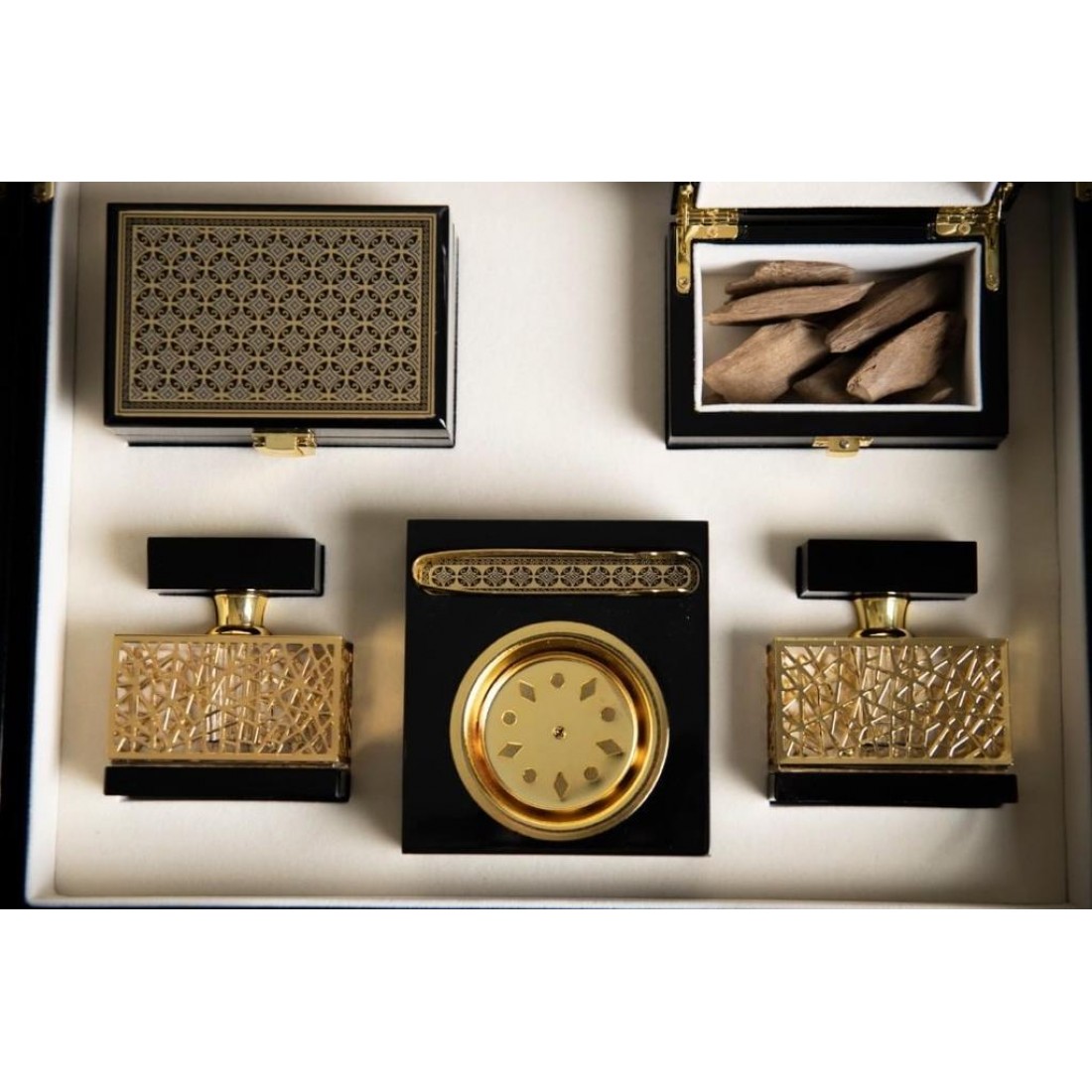 يحتوي على مبخره + زجاجتي عطر+ اوقيتين عود.